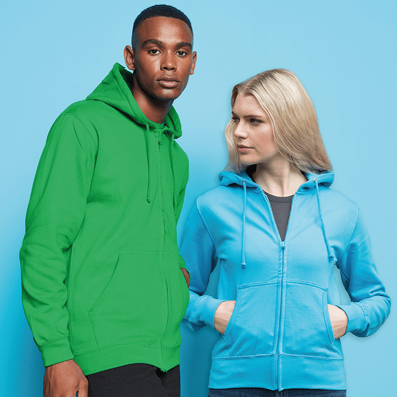 Add a splash of colour with this modern hooded top which features a front zip and is made in a classic fit. It is fashioned from soft cotton-faced fabric for a relaxed casual look. Discover more from AWDis Just Hoods, as part of our complete personalised hoodies range.